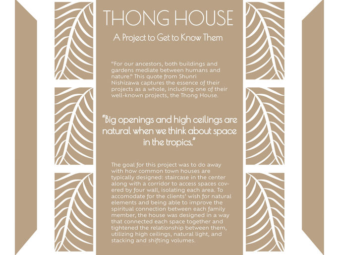 This was a project done to design pages showcasing the style and type of work a designer we admire does. The design group I chose was Nishizawa Architects, an architecture firm based in Ho Chi Minh, Vietnam, who primarily does housing projects, and has a style that is contemporary and minimalistic, heavily utilizing plants and sunlight. I created an animation reflecting elements that the firm uses in their designs, and three pages sharing the origin of the firm, their missions, and a project they have worked on.